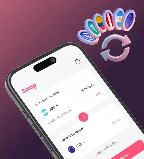 Convierte tu dinero a EUROS, ARS, SOLES, USDT o USDC al instante y sin comisiones. Úsalo de manera local en los países donde Bnka opera.