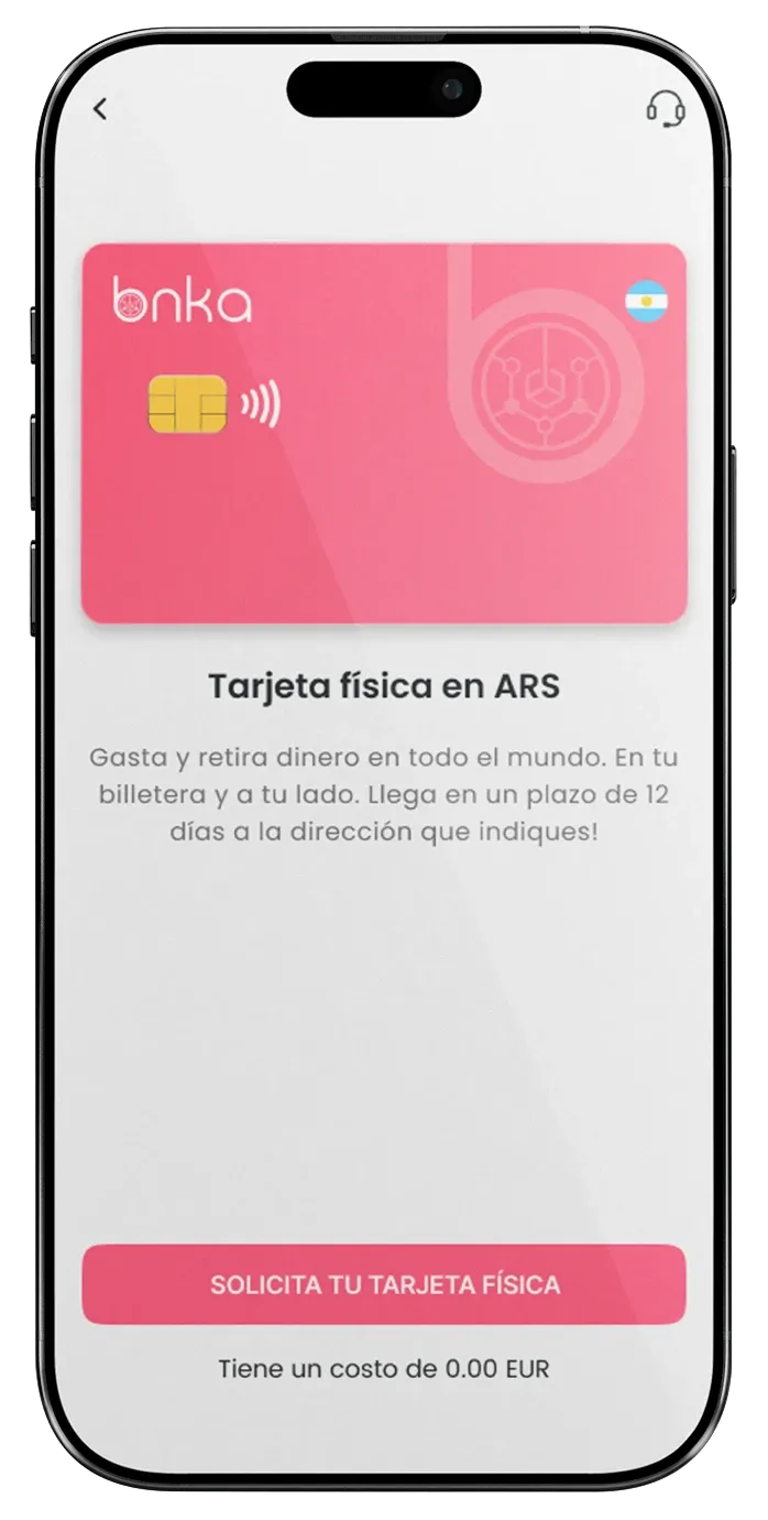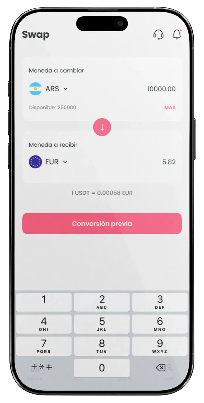 Convierte tu dinero a EUROS, ARS, SOLES, USDT o USDC al instante y sin comisiones. Úsalo de manera local en los países donde Bnka opera.